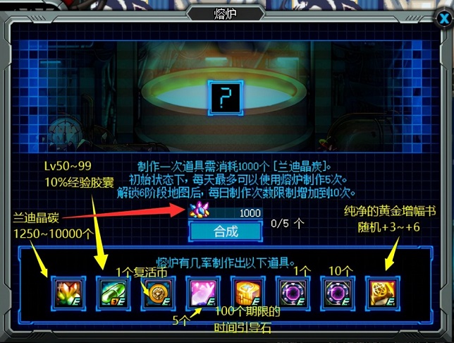 1、可以在熔炉中使用1000个兰迪晶炭制作道具,每天最多可以使用熔炉制作5次。