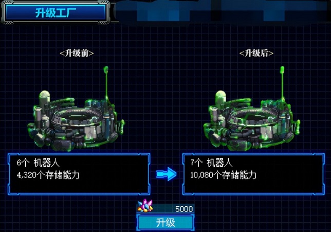 2、升级工厂需要使用兰迪晶炭,升级后可以增加机器人数量及工厂的存储能力。