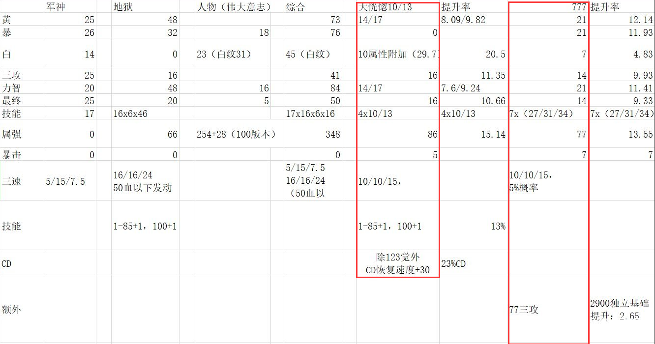 基础模板:无武器,无神话,军神套,地狱套,伟大意志,2900基础独立。 13情况下差距为2.088,5.3,7.715。 10情况下差距为8.57,11.986,14.554。12或以上选大恍惚挺不错的伤害差距不大技能循环也好,10的话有点撑不起伤害了除非你的职业技能循环非常差不然还是更推荐777。