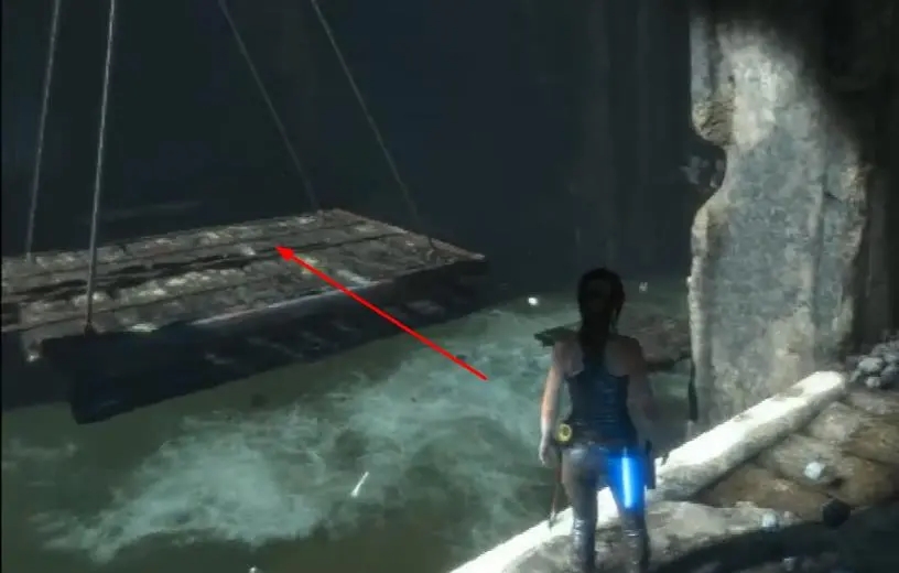 2、跳到对面被挖开的洞里,这时会看到一块被水冲起来的木板,跳上去利用水的流速将其推进到靠近栅栏的地方,这样就可以游到你之前打落的木板上了