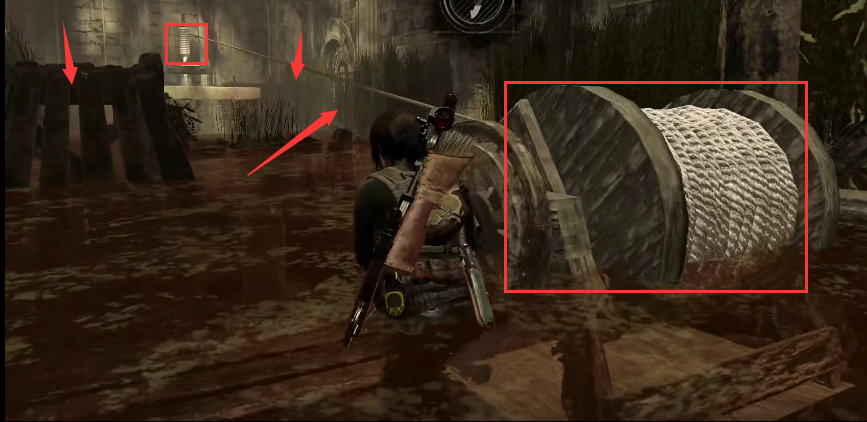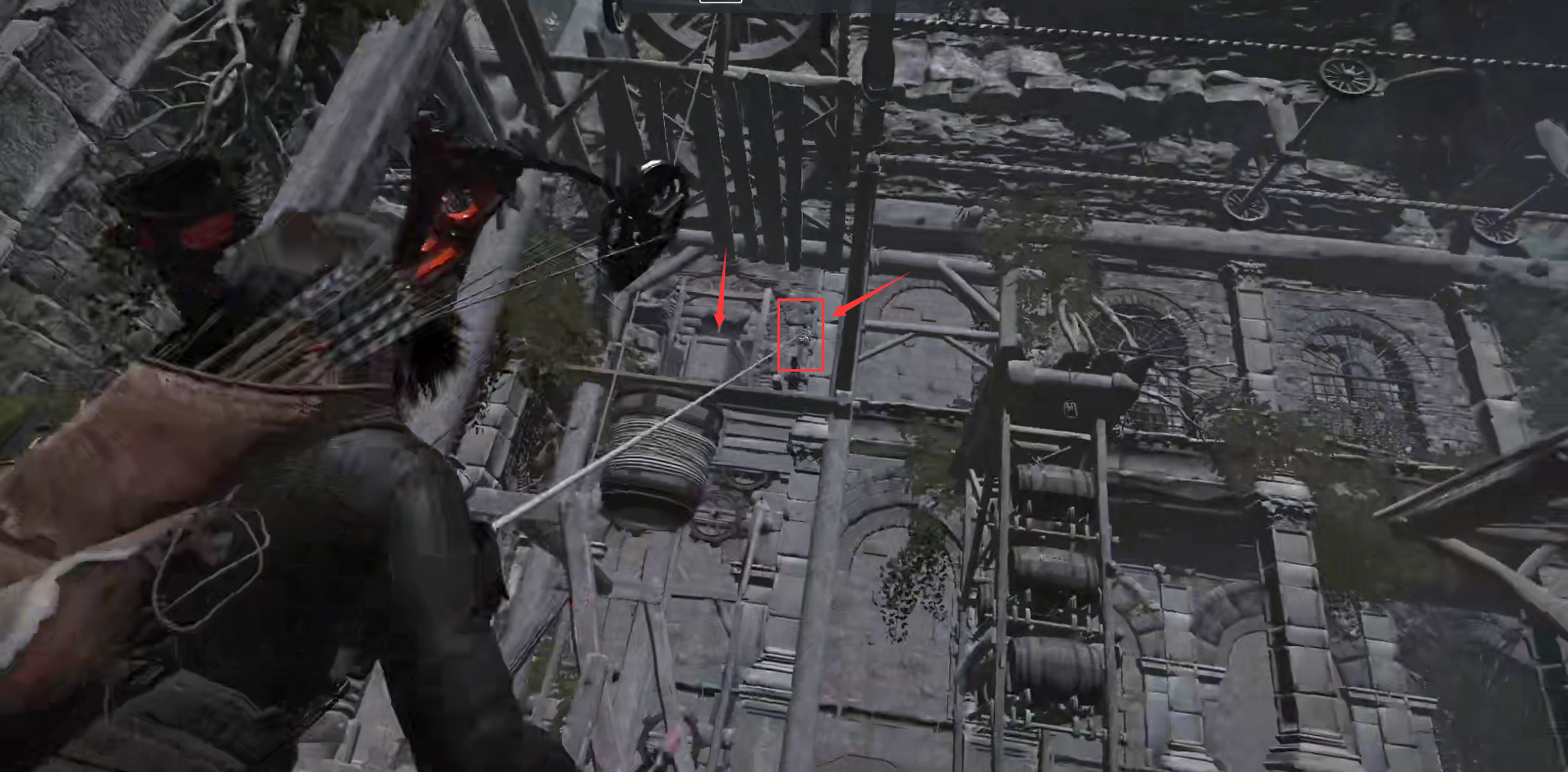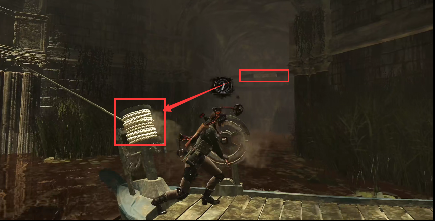 14.再次跑到刚刚的水缸这里,往水缸上面红框框住的绳柱射绳索箭,并拉动,旁边的小门就会打开,流出大量的水