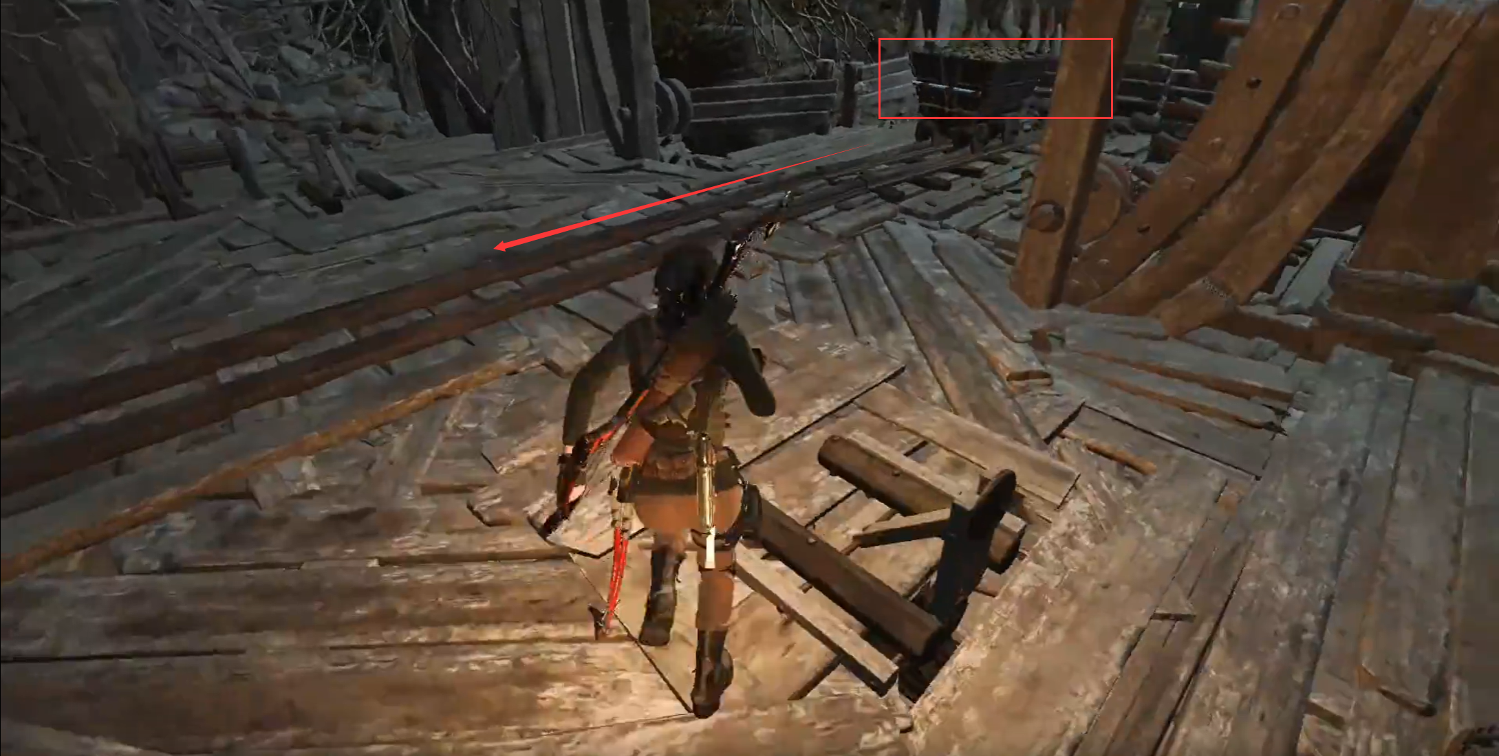 3.根据红框的图腾指引往前,借助横梁跳到对面,注意,这里按【space】键跳到空中接【E】挂住横梁,否则会掉下去