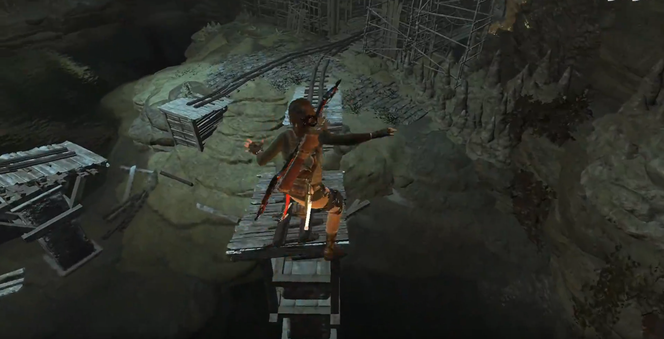 9.这个古墓要借助两条矿车轨道完成通关,首先要先从右边的矿道跑上去
