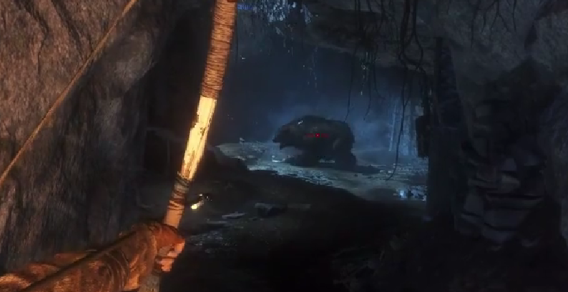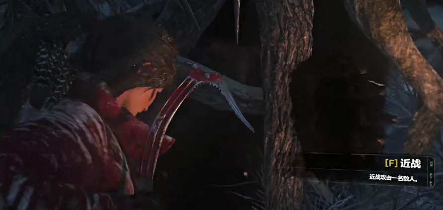 3、接着熊会破开树干进来,根据提示按F挥动斧头,才不会被咬死,之后我们会被熊甩下深坑,触发剧情。