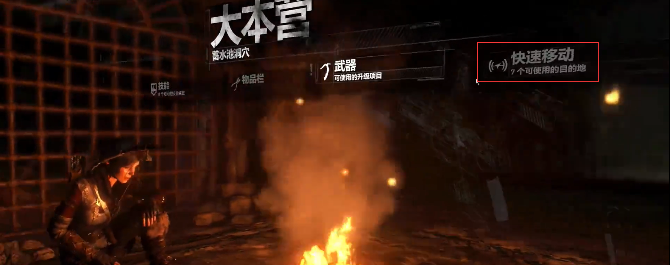 4.用三根木材点燃篝火,打开蓄水池洞穴的大本营,点击【快速移动】