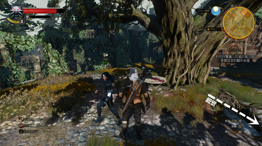 1、首先来到内院,利用L2懦弱者的痕迹,这里跟着叶奈法走就行,到达上层花坛,触发对话,之后照着路线箭头所指方向走,如下图所示: