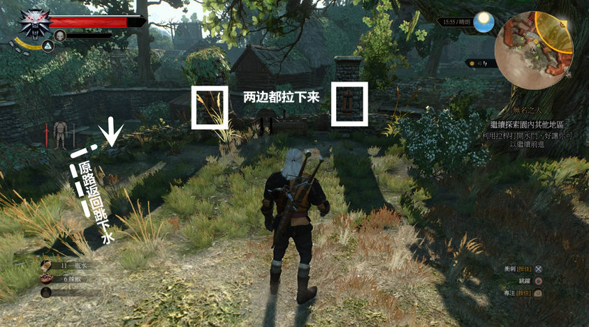 3、然后走到尽头爬出井,把白色方框的两处都拉下来后再次原路返回,如下图所示:
