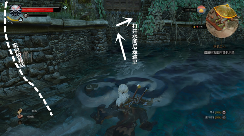 4、原路返回时,发现水闸已经被打开,走中间箭头所指的路,如下图所示: