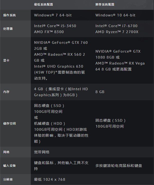 1.处理器最低要求为I5-3450,显卡最低要求GTX760或者RX560系列。
