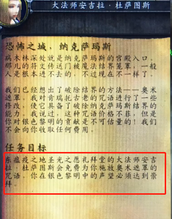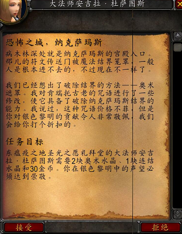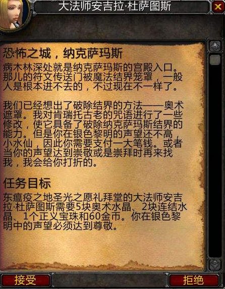 魔兽世界游戏中,接取纳克萨玛斯开门任务以后,会根据玩家的银色黎明声望生成不同的任务目标: