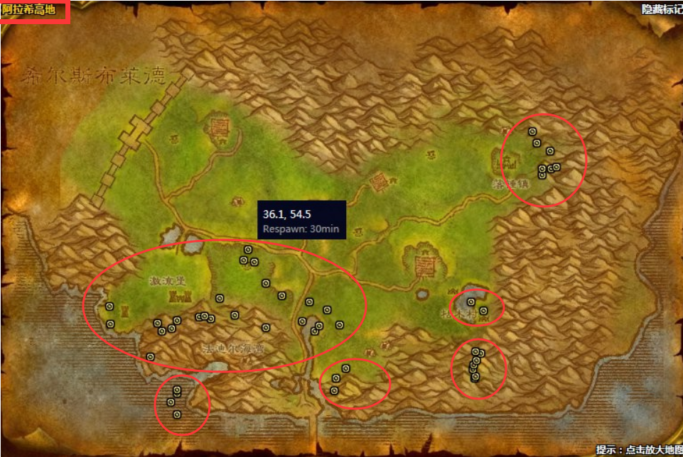 秘银矿石产地广泛分布在30-50的地图,所以在这个范围等级的地图是比较多的。比如费伍德森林、凄凉之地、菲拉斯、尘泥沼泽、千针石林、塔纳利斯、安格洛环形山、奥特兰克山脉、阿拉希高地、西瘟疫之地、艾萨拉、荒芜之地等地图。其中阿拉希高地最多,有47个矿点。