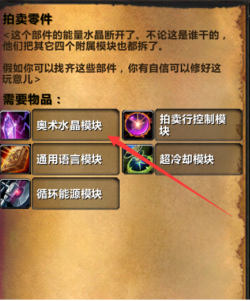 在魔兽世界游戏里,要塞增加拍卖行,需要你建造中型建筑——货栈,水晶模块就是完成古代贸易机的任务的材料之一。它的组成这个模块的零件可以在德拉诺的入侵事件及团队副本找到。