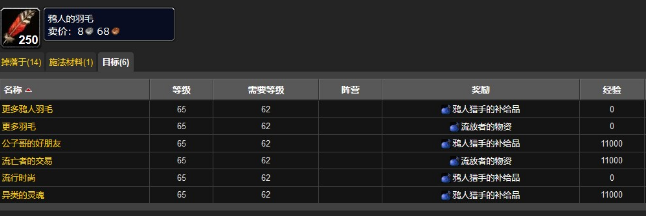 5、任务"流亡者的交易"要求玩家向贫民窟的一个NPC上交30个鸦人的羽毛。该任务在玩家声望达到“友好”前可重复。