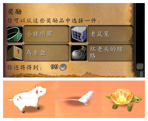 2、活动奖励:一共有四个奖励可供选择,而其中三个皆是小宠物,分别是:小猪项圈(哼哼先生)、老鼠笼(老鼠吱吱)、乌龟盒(飞毛腿),最后一个坏老头的贿赂。