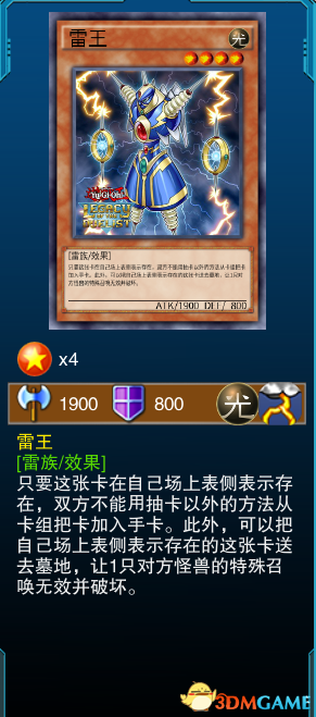 5.打点高。就算满足以上4点,如果只有1000打点,雷王的价值也会受到严重影响,但1900打点简直一览众山小,四星怪兽只有少数能突破这一打点,而高过他打点的一般都属于特殊召唤的,又进入4,而你不解掉他,他又有3的强力干扰。对于先手玩家来说,场上挂一个雷王会让对手相 当头疼