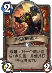 再来看看监工这牌,打海盗其实很不错,上来解一个,站一个2/2,打后期呢,可以给自己人加攻击力配合抢血(现在我们不大可能跟青玉德和大王术打疲劳吧!),配合苦痛过牌,配合527,配合吼爹,所以选择满编。