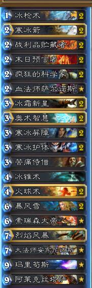 可替换卡牌:冰锥-冰甲或老司机(原版是不带冰锥带双冰甲的,我更喜欢控场法术所以去掉了一张冰甲) 暴风雪-冰锥