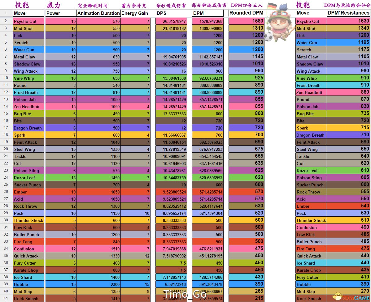 上图是reddit大神整理的快速技能评分表格,我只翻译了第一行,第一行最后一个“DPM与抗性综合”稍微解释一下,是基于该技能被克制以及克制的属性数量来的,比如毒系克的系最少,所以即使技能威力高,评分也很容易下降。
