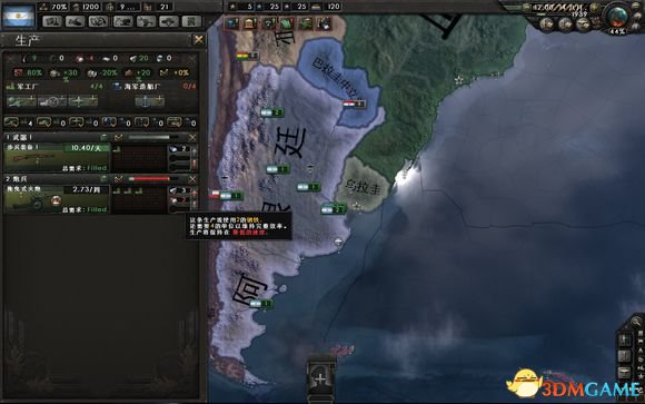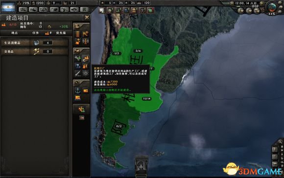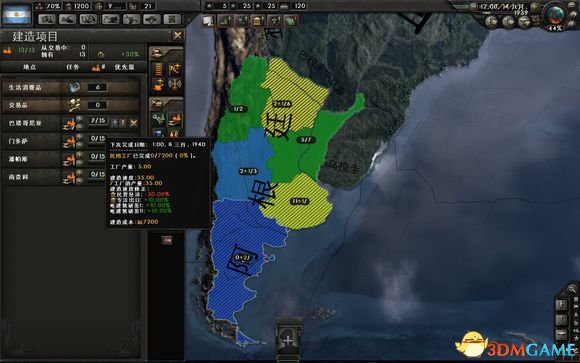 第一行就是 巴塔哥尼亚地区,我计划新增2座民用工厂, 后面显示7/15 就是我们开始闲置的民用工厂一起开工了,一个工厂最多15家工厂帮他。一个工厂提供5,7个一起每天提供35,那些加减BUFF刚好互相抵消修建一个工厂总共要7200,所以需要7200/35=205天,现在是1939年八月14日,205天之后就是1940年三月8日。