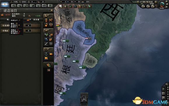 首先,我们点一下 民用工厂的按钮,国土上就出现了一些 0/2之类的数字,意思是这块地总共能造多少厂。有地就有工厂,有工厂就有军备,有军备就有军队,有军队就能抢新地盘,有新地盘就有新工厂!想想是不是很带感。