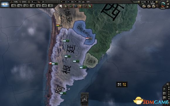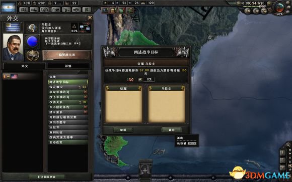 右上角一个地球,下面一个百分比 已经50%了,意思是可以准备宣战了,我们选择乌拉圭