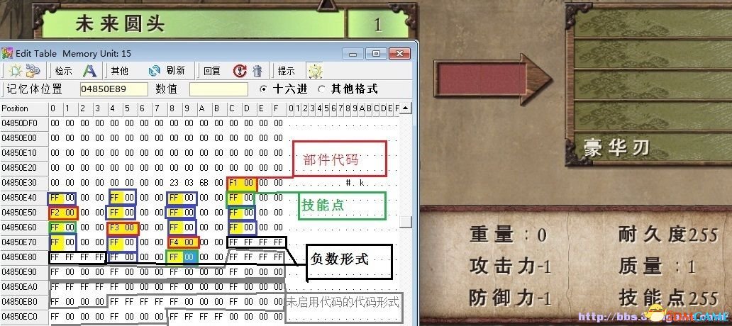 注意:如图中所示,再最后一组红框“F4,00”和相对该组的绿框“FF,00”中间,有黑框“FF,FF,FF,FF”,这4个FF代表的意义就是图中未来圆头攻击力和防御力负一(-1)的情况,