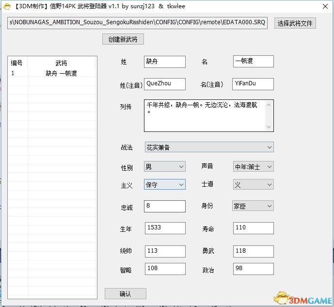 2、点击左边的列表选择要修改的武将,在右边修改各项参数和内容,点下面的 确认 按钮,将会把修改保存到文件。