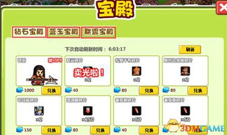 钻石宝殿的下方会显示玩家拥有的金币数量和钻石数量,商品下边显示的是兑换该商品需要花费的钻石数量;蓝玉宝殿界面的商品都是通过蓝玉牌来兑换的,界面右下方会显示玩家拥有的蓝玉牌数量。商品下方也会显示兑换需要的蓝玉牌数量。玩家可以通过在竞技场和其他玩家进行武将PK获得排名每晚21:00结算后根据排名获得相应的蓝玉牌;联盟宝殿中有黄玉牌、绿玉牌两种商品。界面下方会显示玩家拥有的黄玉牌和绿玉牌的数量。商品下方会显示兑换需要的玉牌数量以及玉牌颜色。黄玉牌是通过盟战抢城池中,在所属联盟内积分比例获得的。绿玉牌是联盟盟主在抢城池中,通过联盟总积分排名,按照比例获得的,联盟积分排行以及盟内积分排行都会在周日晚22:00统一结算。