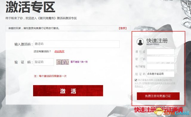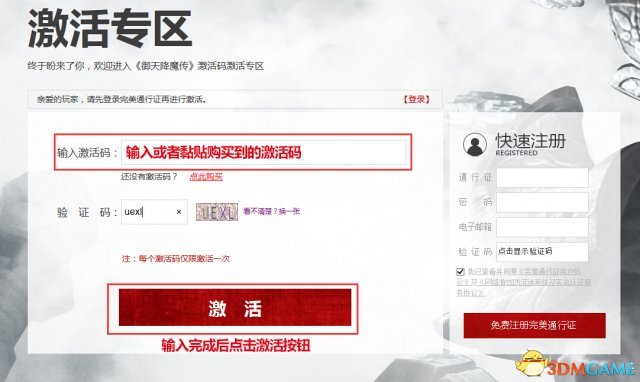 第三步,复制或者输入您在官方天猫商城购买到的激活码,或者官方合作渠道(如3DM等)购买后获得的激活码,输入到激活专区中的输入激活码位置(如下图红框出),再输入页面的验证码,点击激活即可完成游戏激活。您将可以在正式开服后,进入到御天降魔传游戏中。