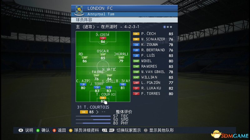 进入到阵容菜单当中,按RT键或者LT键可以查看球员的状态以及总体评分。
