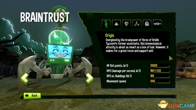 覆盖:大脑袋蜘蛛在周围发射导弹遮盖区域,可以隐藏我方单位【主动技能;冷却时间50Sec;持续时间10Sec;攻击速度增加15%】