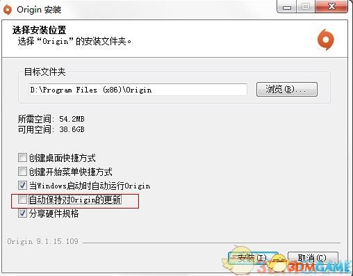 6、安装解压后文件夹内Extra文件夹下的OriginSetup_9.1.15.109.exe,安装这个版本的Orign客户端,安装过程注意去掉自动更新的勾,如下图。(PS: 破解可能只支持这个版本的Origin客户端,尽量别升级)
