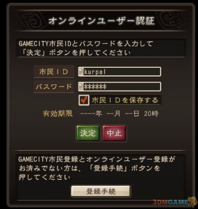 安装进入游戏直接选择第一个进入在线对战,会弹出对话框要求输入ID/PASSWORD,注意对话框下方的“登陆手续”按钮,点击它进入注册流程