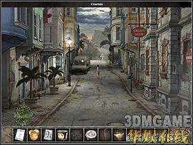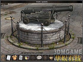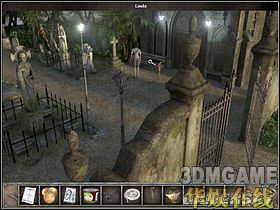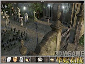 伯爵被警察带走后,下船,往前来到有人座大炮处。在地上拿起一个铁环。然后向左,再向前来到一条街上。沿着街一直往前走,来到一片墓地。在门口会遇到一个女人。