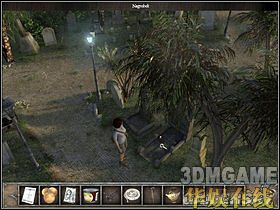 Behind the gate, approach the bench (zoom), open the chest that’s lying on it and take the wire brush. Go along the main alley (up the screen). Once you reach the intersection, head down. Take a look at the gravestone under the big palm (zoom).