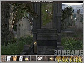 There’s a candle burning on this grave and the tombstone is dirty (as most of them in fact). Clean it with the brush. Unfortunately the name is still not visible - the palm is giving too much shadow. Take the candle from the grave and light the tombstone. This way you will learn that it’s Brigg’s grave.