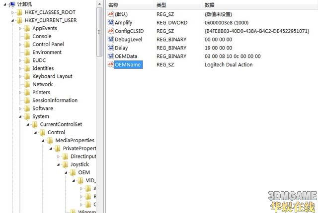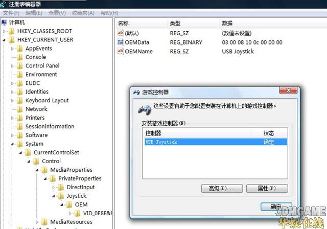 在注册表依次打开HKEY_CURRENT_USERSystemCurrentControlSetControlMediaPropertiesPrivatePropertiesJoystickOEM