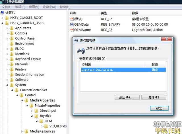 右边有个OEMName字符串值改成Logitech Dual Action 就可以了如图