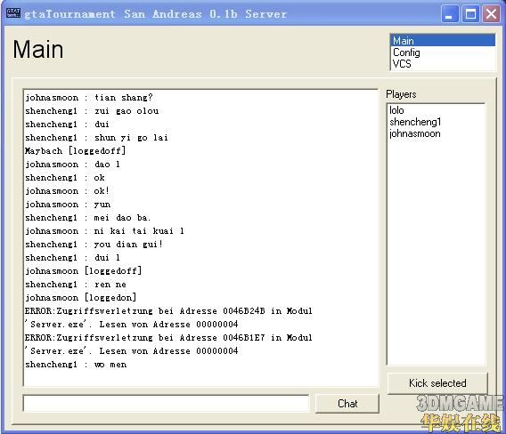MIAN-主画面,左边显示当前服务器讯息和玩家聊天记录,右边PLAYERS是玩家列表,KICK SELECTED是踢人,CHAT发送聊天讯息