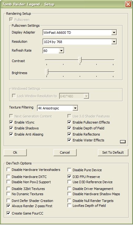 看到这张图,是不是和你的不太一样?这只是修改注册机码所开出来的秘密选项。不少人抱怨说TRL(Tomb Raider:Legend 缩写)的设定怎么会这么粗略,据传是EIDOS的主意,目的为何就不清楚了。不过你还是有办法将这些选项打开来的,现在有个简单的方法,只要下载这个注册表档案就行了。