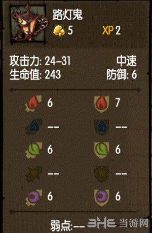 草攻击:6 草属性防御:6 暗攻击:6 暗属性防御:6 火攻击:6 火属性防御:7 弱点:无