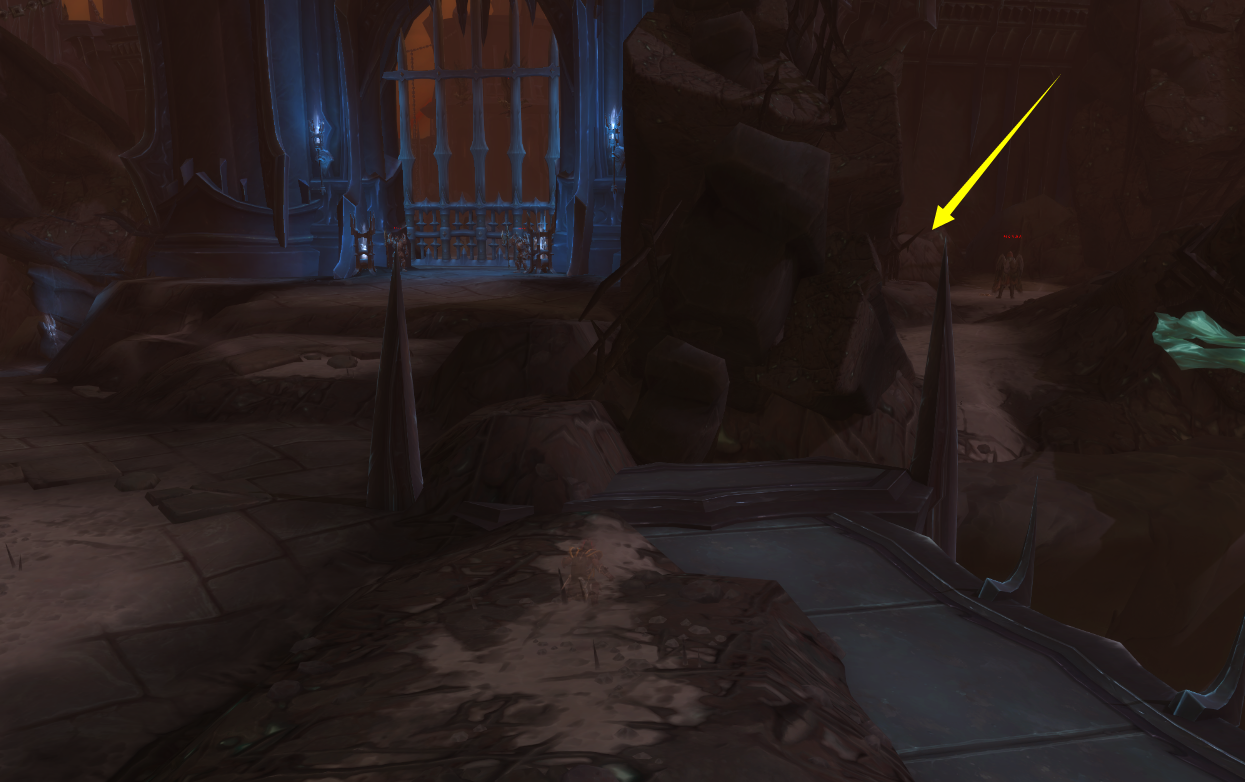 注意是在城墙外面,玩家在破灭堡外面,面朝着破灭堡的大铁门的时候,右手边有一条小路,就在差不多箭头指着的位置: