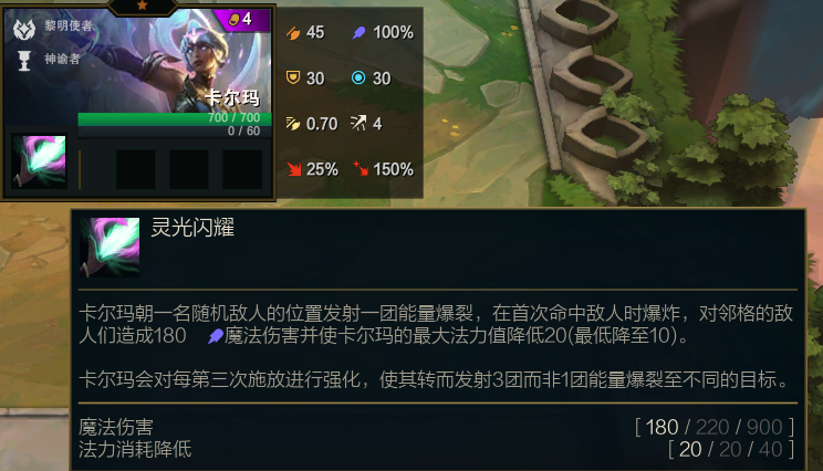 卡尔玛解读:定位后排爆炸输出,面板属性在4费中中下,攻击力只有45,中等攻速0.75.技能群伤,低伤害。但释放技能可以降低法力值20,最低一次普攻一次技能,三次技能也就是10点法力值的时候技能变为3团,输出开始爆炸。