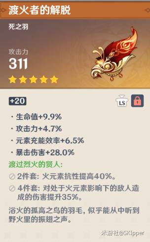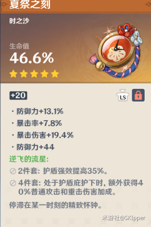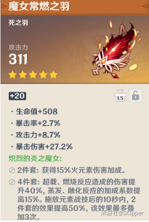 哪怕你技能只升到了6级,用的五星武器,这里依旧是生命值% 优于 攻击力%,更不用说,如果用四星武器,更高的技能等级了,那么我们的圣遗物选择当然是 生命沙 暴击/爆伤头 和火伤杯,副词条优先选双爆, 其次是生命值%>攻击力%>攻击力>生命值。