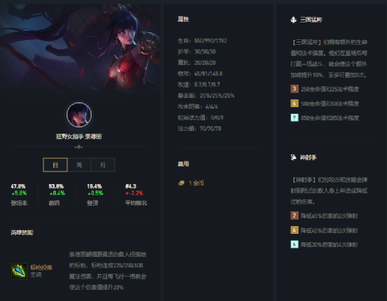 豹女是我们阵容的主C,在这个版本中豹女的强度超高,其最强的就是技能,3星豹女技能伤害只有600看似不高,但请注意其后面的技能描述,技能是朝最远目标投掷,标枪每飞行一个格子伤害值提升20%,咱们的棋盘是7*8的(横7竖8)这就比较变态了,咱们不用飞行8个格子只要5个格子豹女技能伤害就翻倍了在加上三国提供的法强与射手羁绊提供的弹射,一标秒一群,简直就是上版本的烬(烬是4此普攻,豹女携带青龙刀是5次普攻,携带青龙刀+飓风是4次普攻)。特别是这版本神射羁绊全等级+1溅射目标,伤害更猛烈。