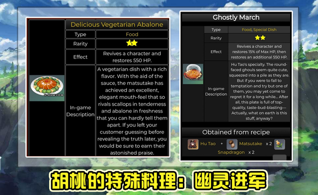需要的材料是2松茸+2金鱼草,效果是复苏角色,并恢复550点生命值。如果用胡桃烹饪这道菜,有几率产出特殊料理幽灵进军,效果也变强了,复苏角色,恢复550点生命值,还能额外恢复15%最大生命。(可能会有略小改动以官方为准)