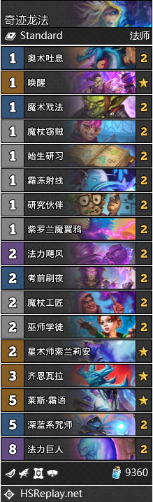 现在奇迹法有两种主流的构筑,我们觉得两者强度基本相当。其中之一是由Orange开创的奇迹龙法。构筑中加入了深蓝系咒师来提供额外的资源。虽然卡组中一共就两条龙,但奥术吐息的表现依然足够出色。因为5费随从较多,詹迪斯巴罗夫就失去了位置。