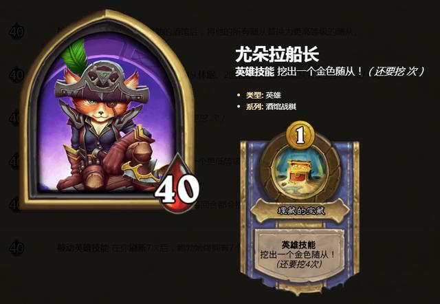 尤朵拉船长,也是我们口中的挖金小狐狸。这英雄挖金色随从对阵容提升还是很大的,虽然可能玩到很垃圾的随从,但三连得到的高费随从也是能有计划找到关键牌了。虽然是要花费4个铸币用来挖,不过这个技能真的不亏还稳装。在特定时间玩宝升本找到关键随从,这估计也就只有小狐狸可以做到了,!