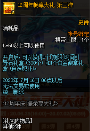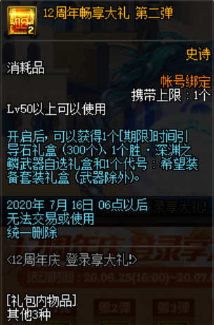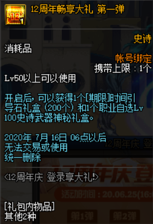 第一弹是200个引导石和一个本职业随机的100级史诗武器礼盒(自古红眼出光剑)。
