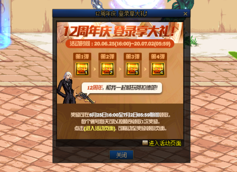 dnf12周年登录活动奖励申请时间:2020年6月20日20:00~2020年6月22日05:59,需要在游戏中点击申请奖励按钮。奖励领取时间:2020年6月25日16:00~2020年7月2日05:59,需要登录周年庆活动页面(web端)进行领取,总共四弹,每天可以领取一次。
